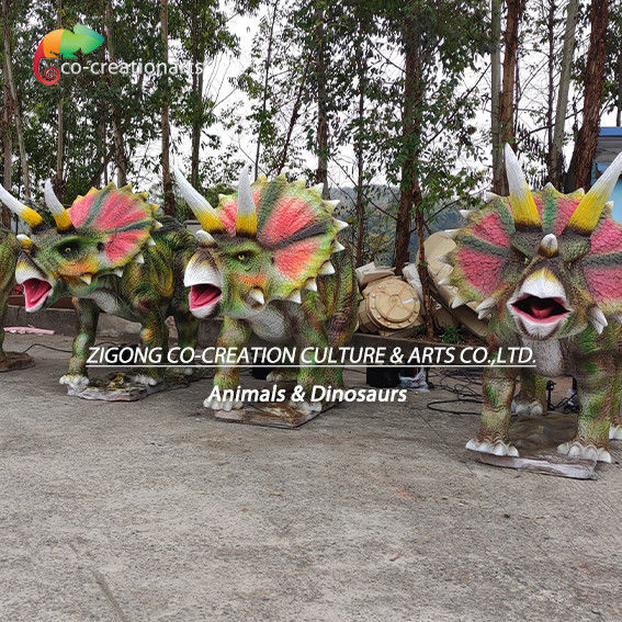 Positioned in unison on a natural terrain base against a woodland backdrop, the group replicates a Cretaceous-era herd guarding territory. Crafted by Zigong Co-Creation Culture & Arts, these lifelike models support customizable movements (head turns, vocalizations, limb motion) for immersive theme park installations or educational dioramas. Ideal for creating unforgettable "living dinosaur" encounters.